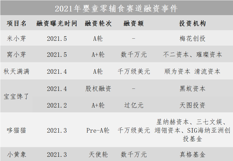 2021年春節過后的三個月的時間內,這個賽道至少已經發生了7起融資事件,真格、順為、梅花、天圖、黑蟻、清流等知名機構不斷押注,這個賽道就是嬰童零輔食。